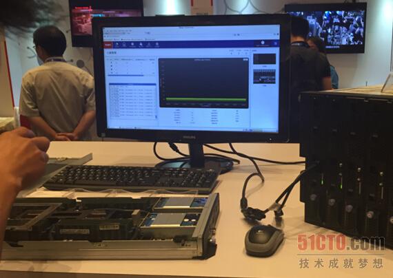 同时在曙光技术大会上展示了另一款高能效的技术,全液冷产品。该产品现在还处于研发阶段,主板等部件全部浸泡在无腐蚀不燃导热性佳的液体里,展区工作人员表示该液体主要成分是油,可大幅降低能耗,相比传统数据中心能耗降低90%以上,PUE可达1.05以下。